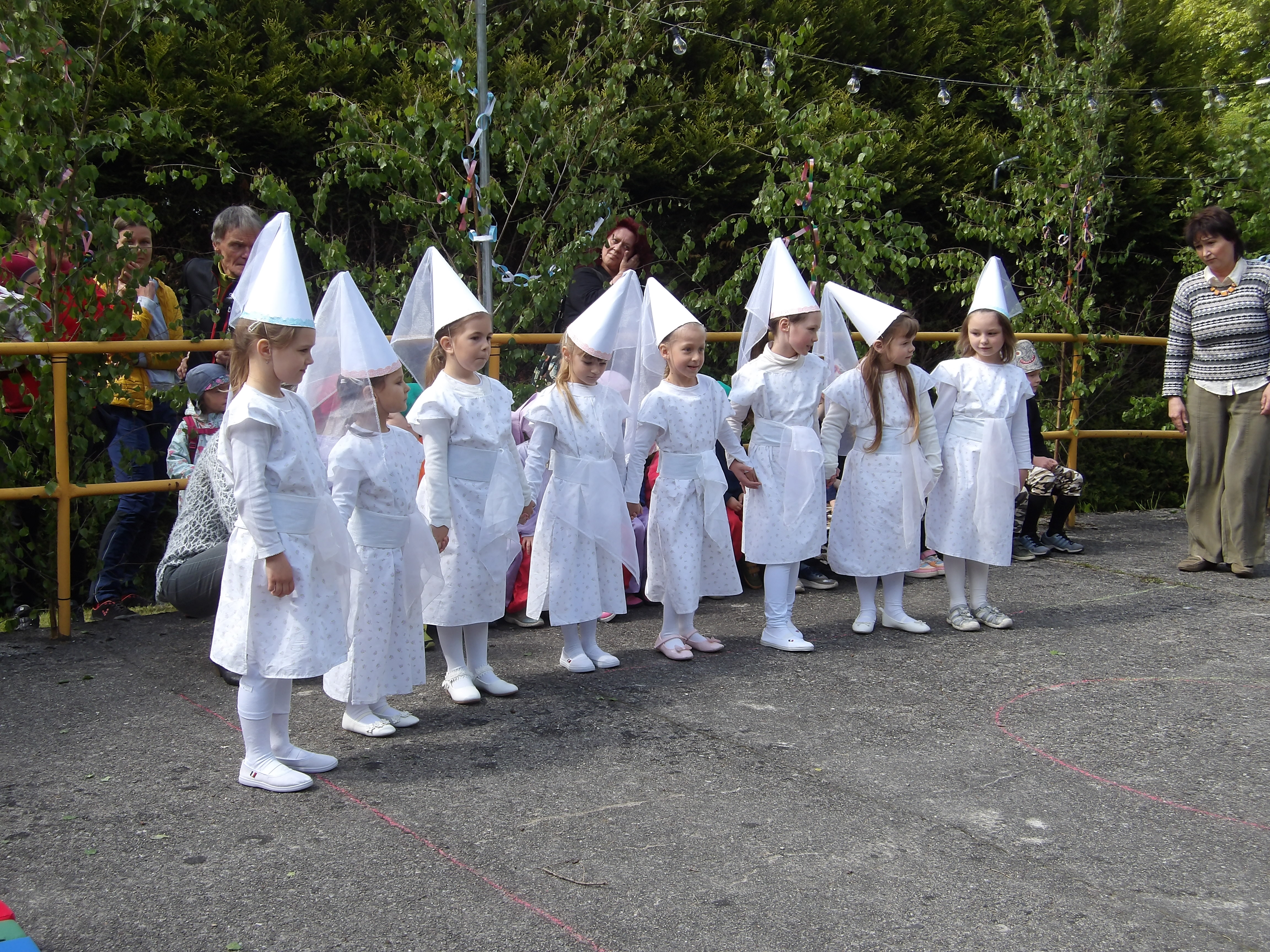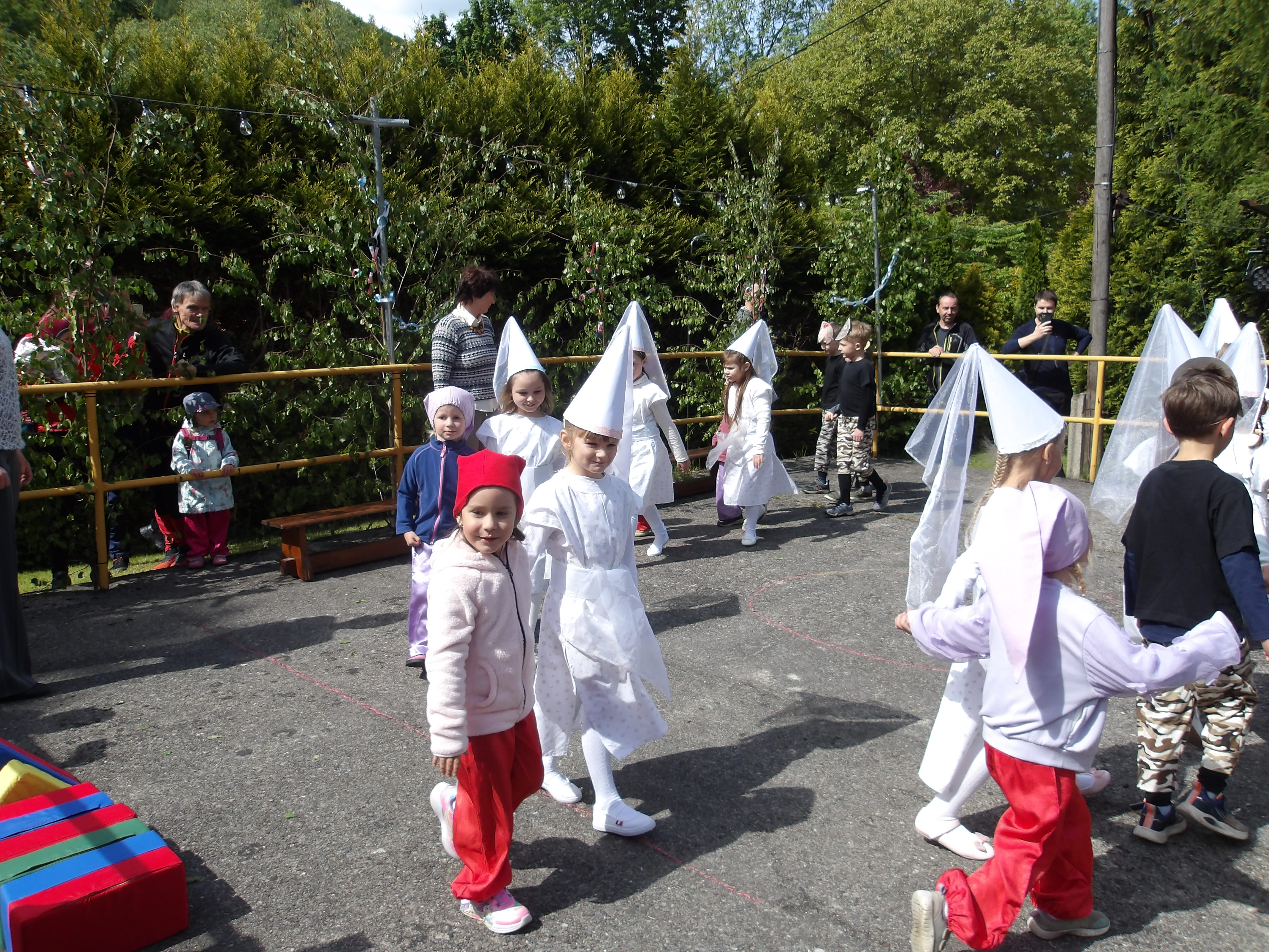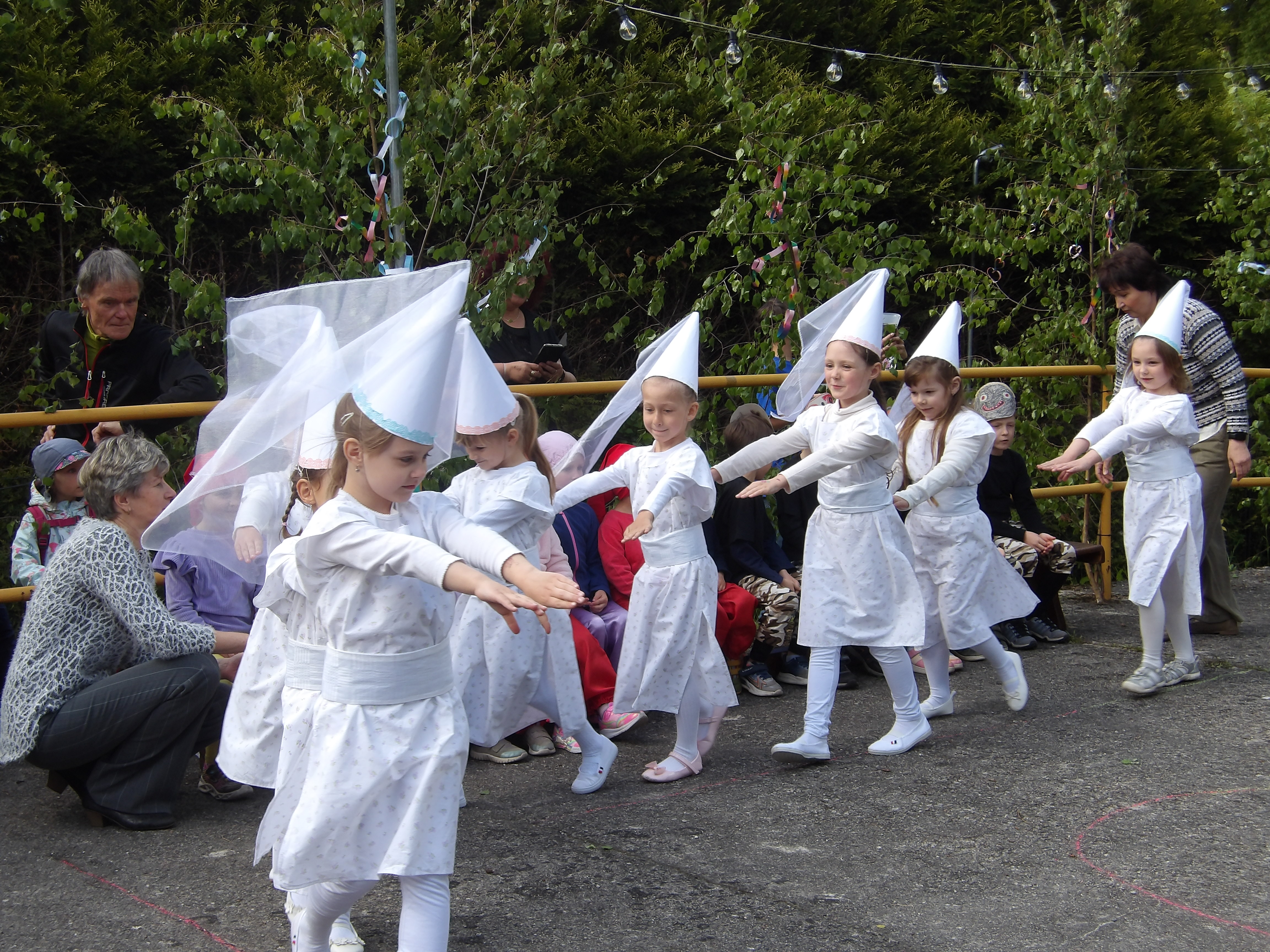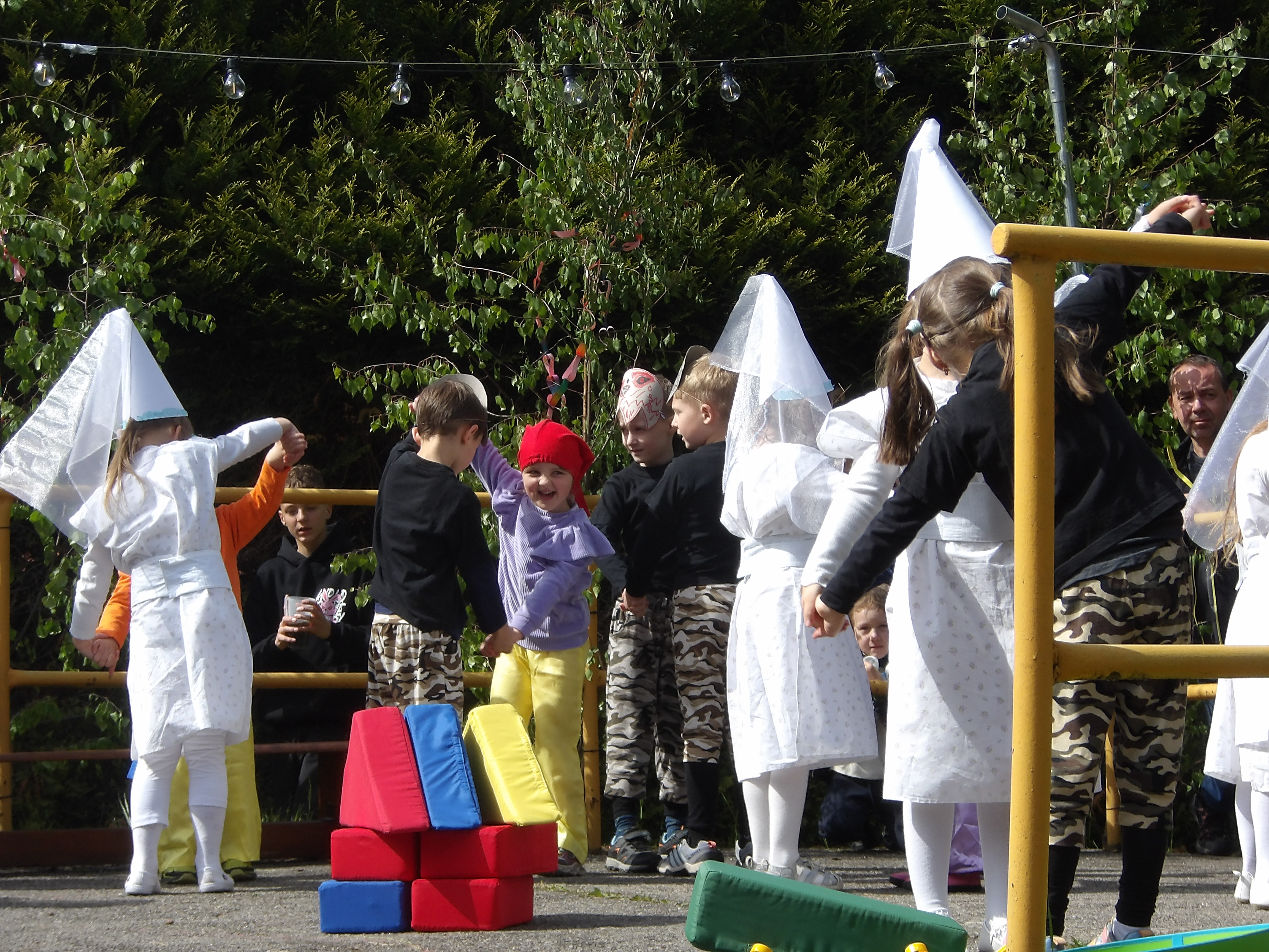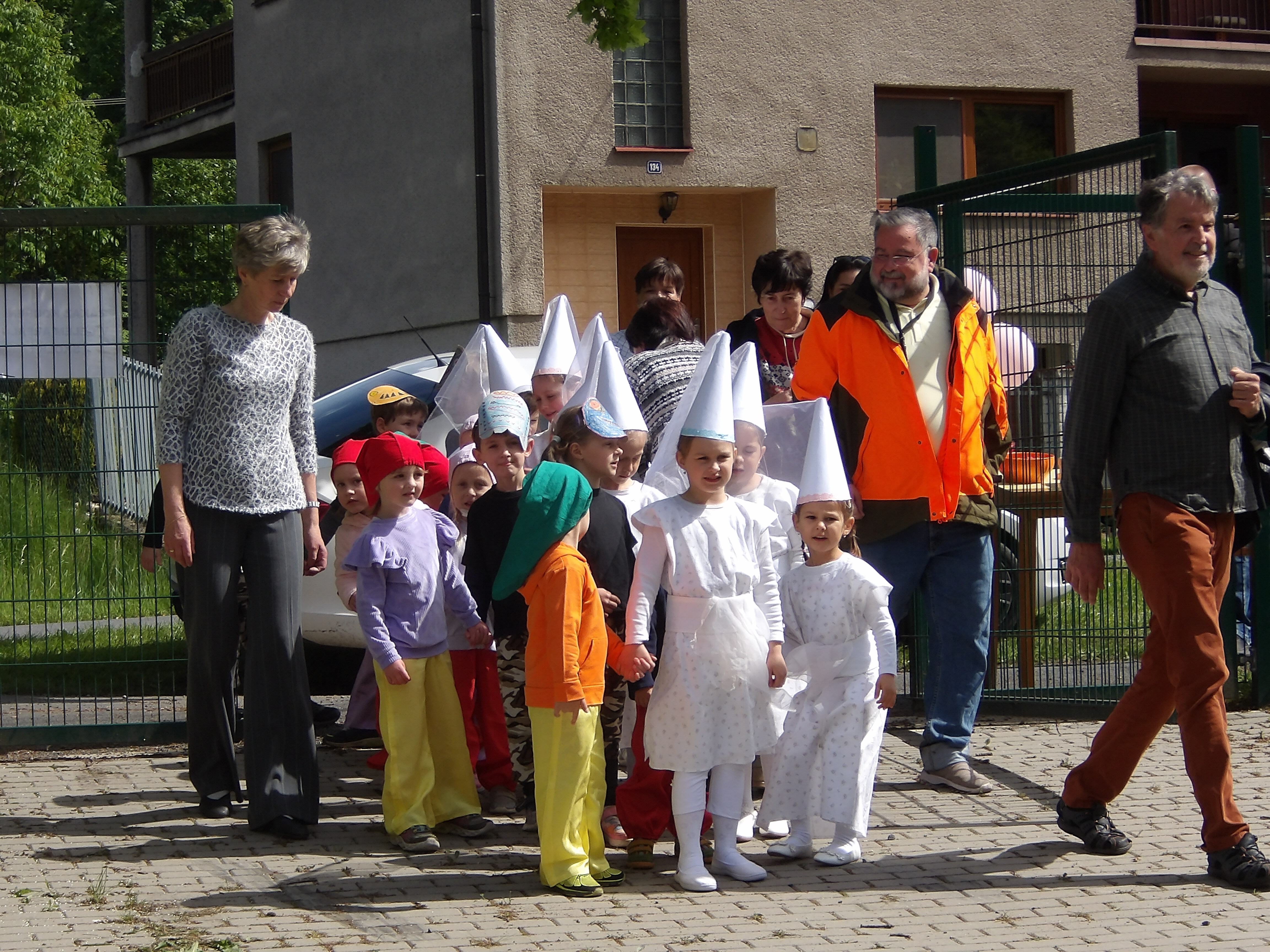 Tentokrát jsme se nechali inspirovat českým hudebním filmem. Dětem se písně okamžitě zalíbily, a tak vznikly tanečky pro bílé paní, kluky, co se bojí ve staré ruině hradu a samozřejmě trpaslíčky, kteří pomáhají s obnovou. Nejdříve jsme pilně nacvičovali...Pak už stačilo jen vyprosit si slunečné počasí a samozřejmě píle rodičů všech dětí, kteří se podíleli na přípravě zahradní slavnosti a úspěch byl na světě. Děkujeme všem za hezký zážitek