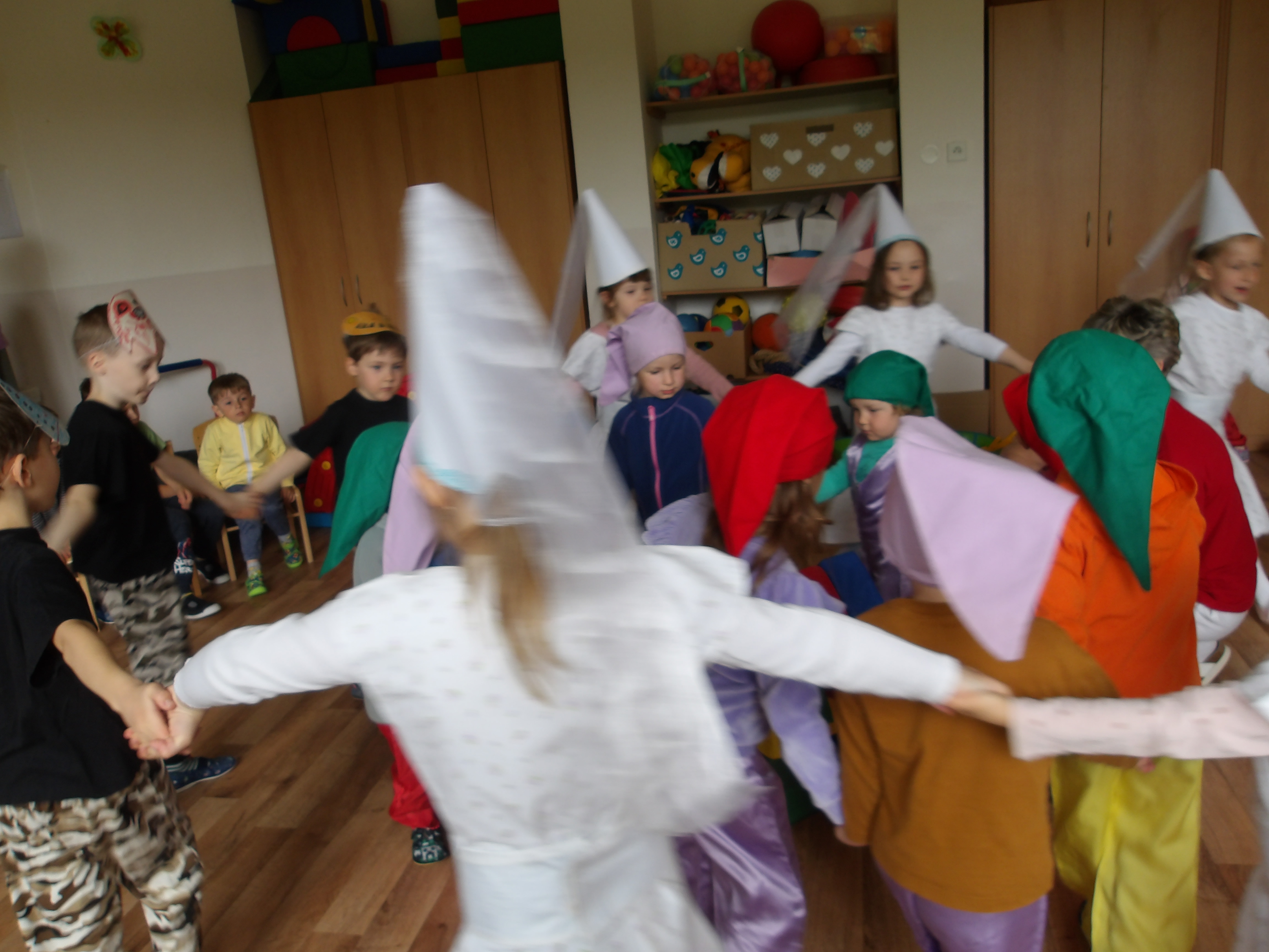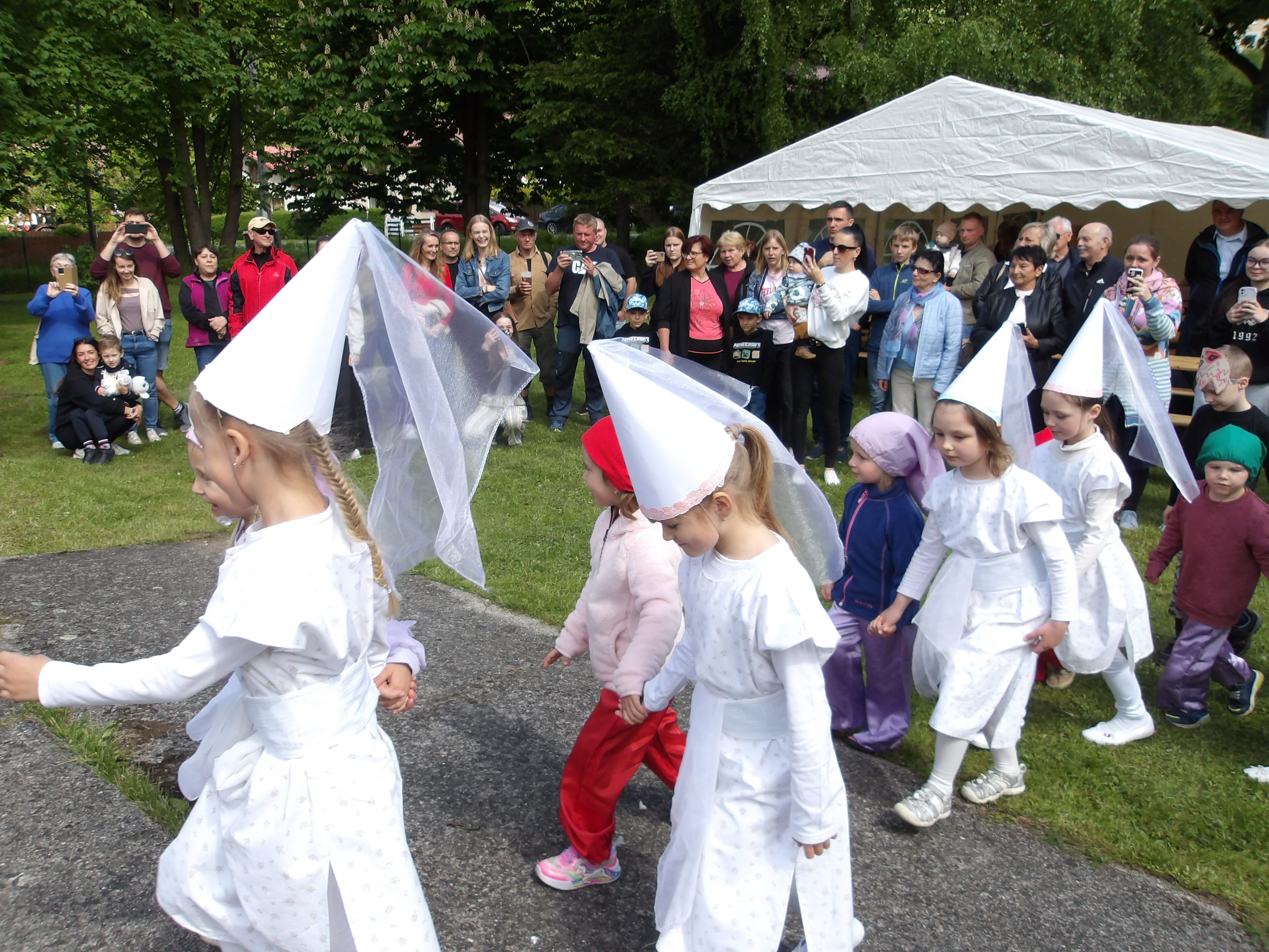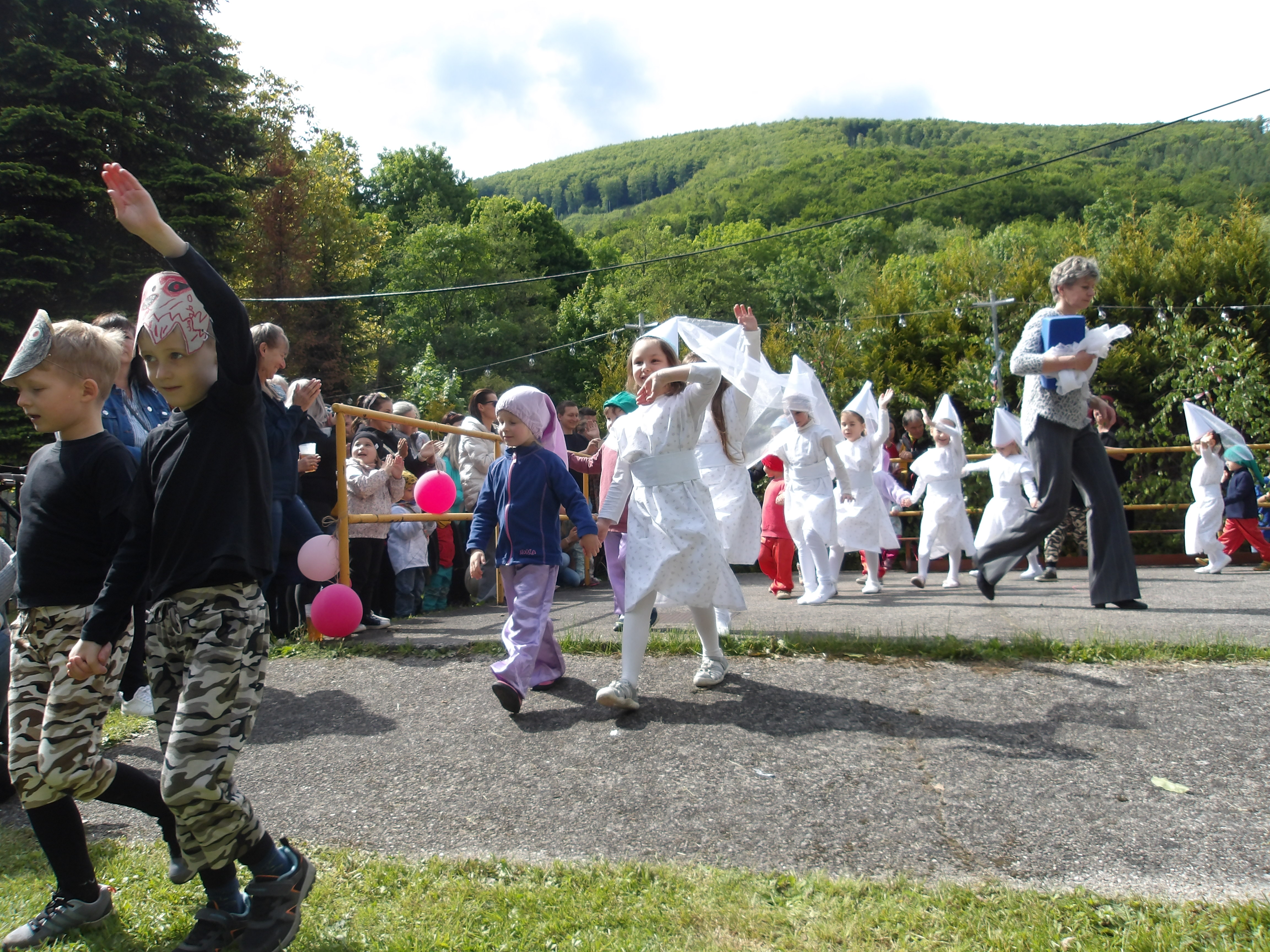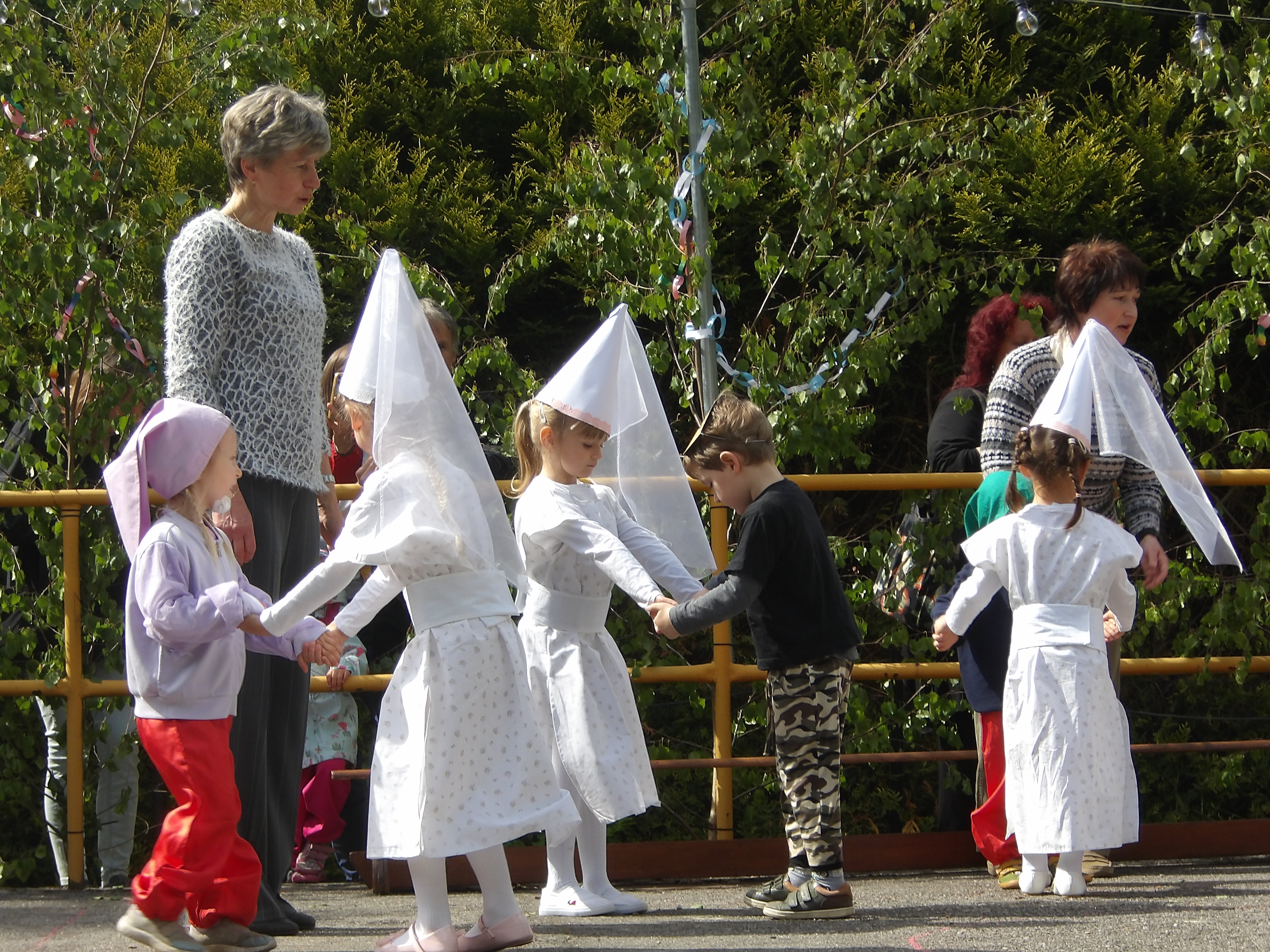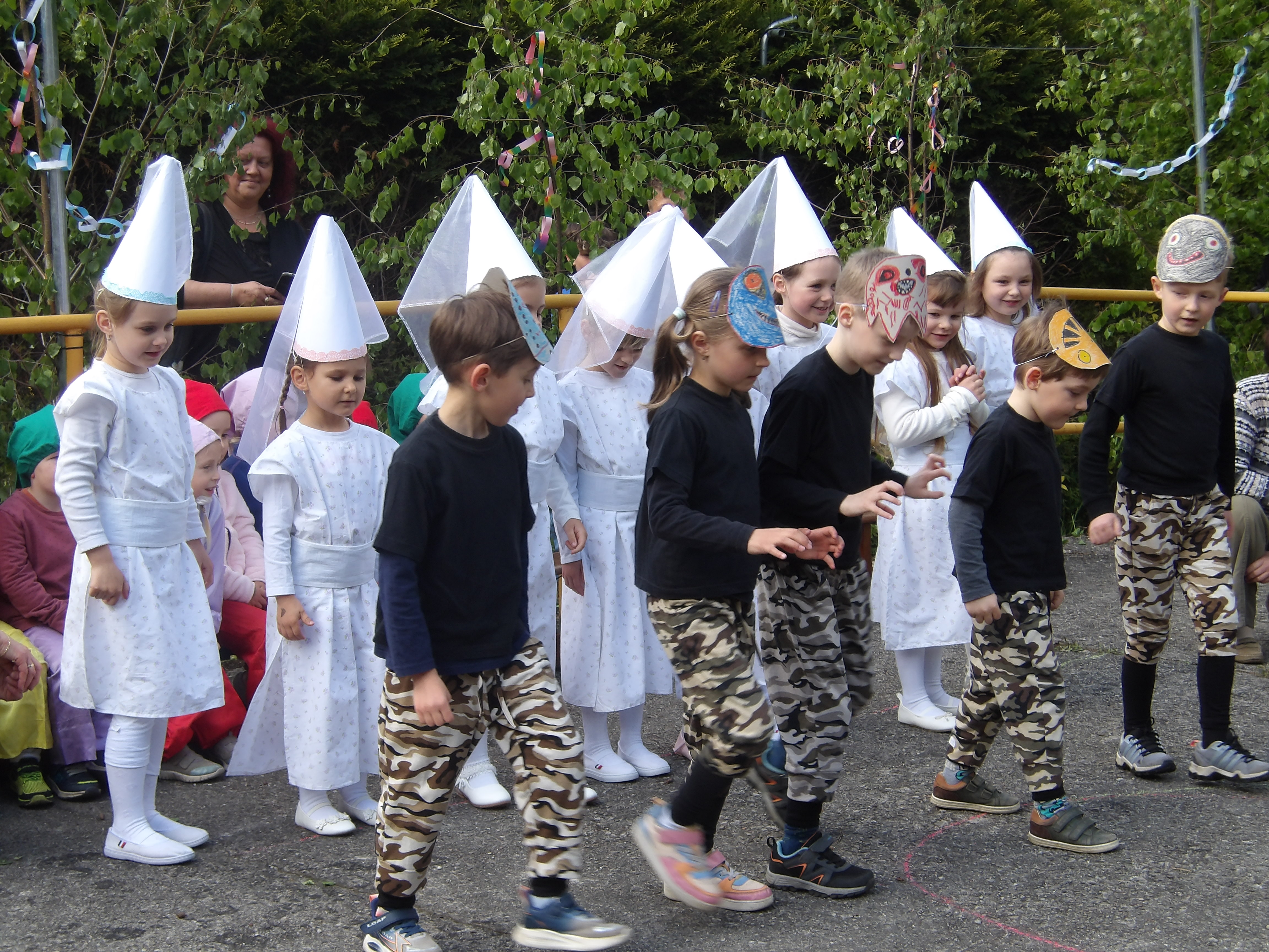Tentokrát jsme se nechali inspirovat českým hudebním filmem. Dětem se písně okamžitě zalíbily, a tak vznikly tanečky pro bílé paní, kluky, co se bojí ve staré ruině hradu a samozřejmě trpaslíčky, kteří pomáhají s obnovou. Nejdříve jsme pilně nacvičovali...Pak už stačilo jen vyprosit si slunečné počasí a samozřejmě píle rodičů všech dětí, kteří se podíleli na přípravě zahradní slavnosti a úspěch byl na světě. Děkujeme všem za hezký zážitek