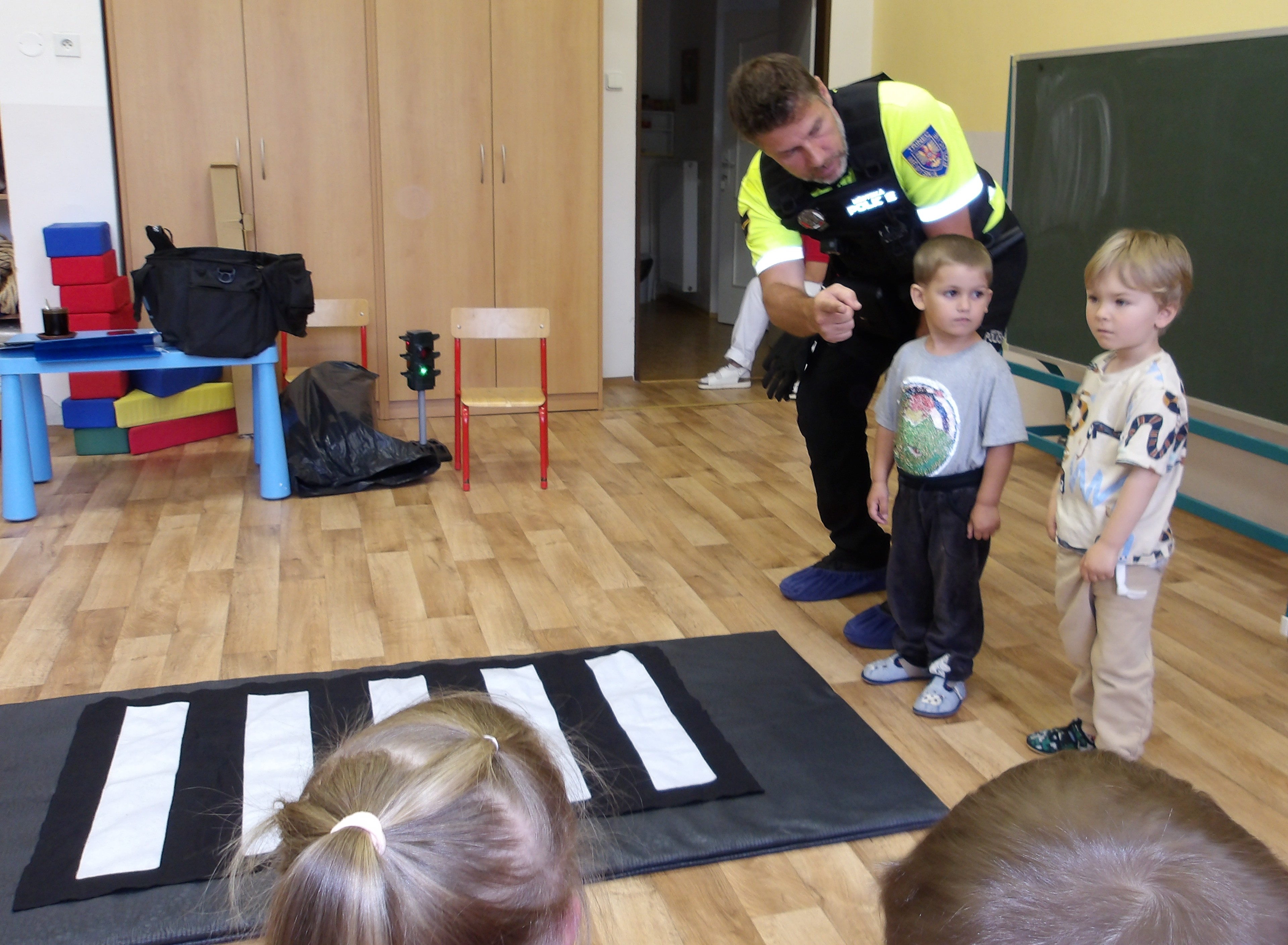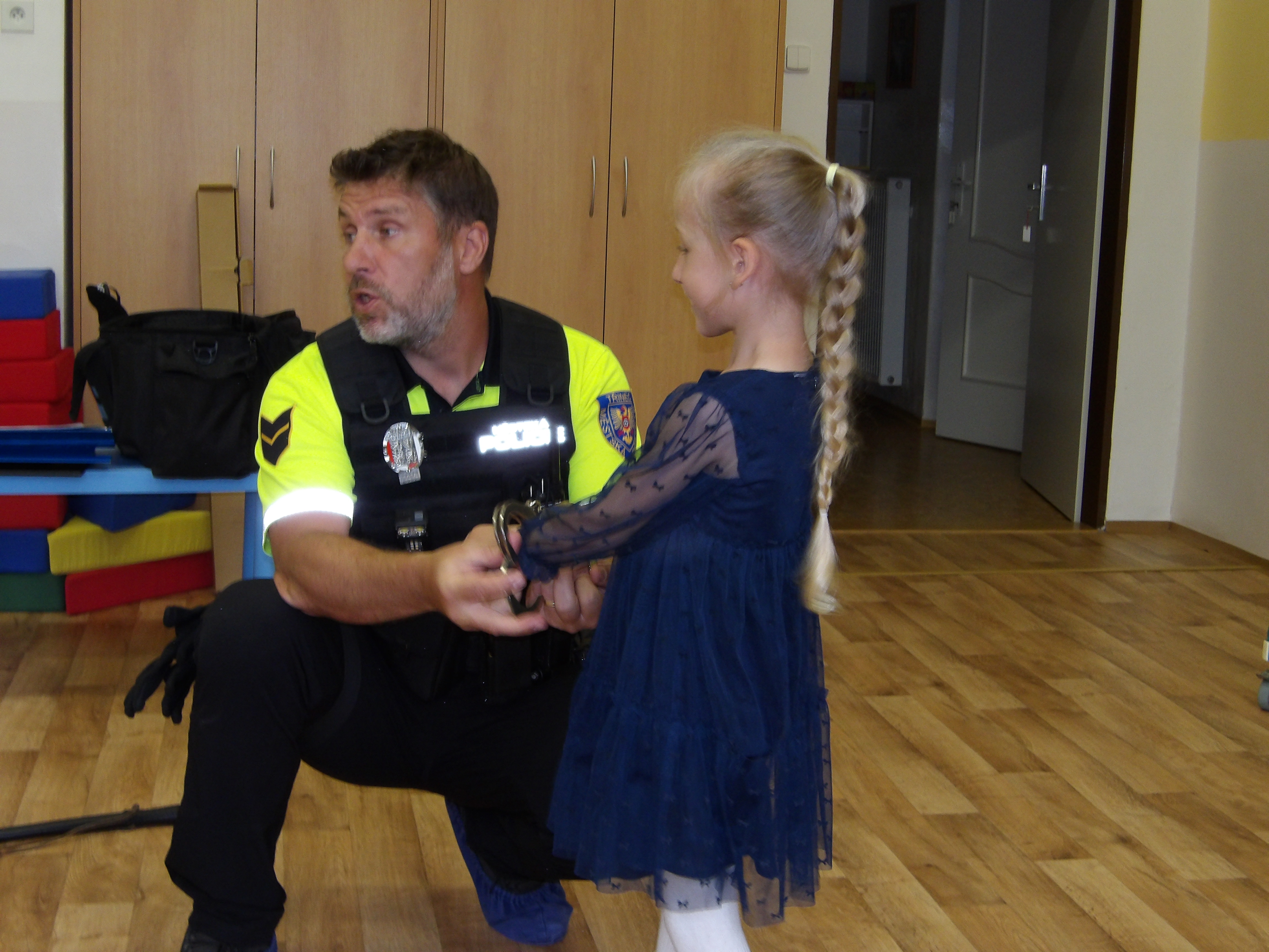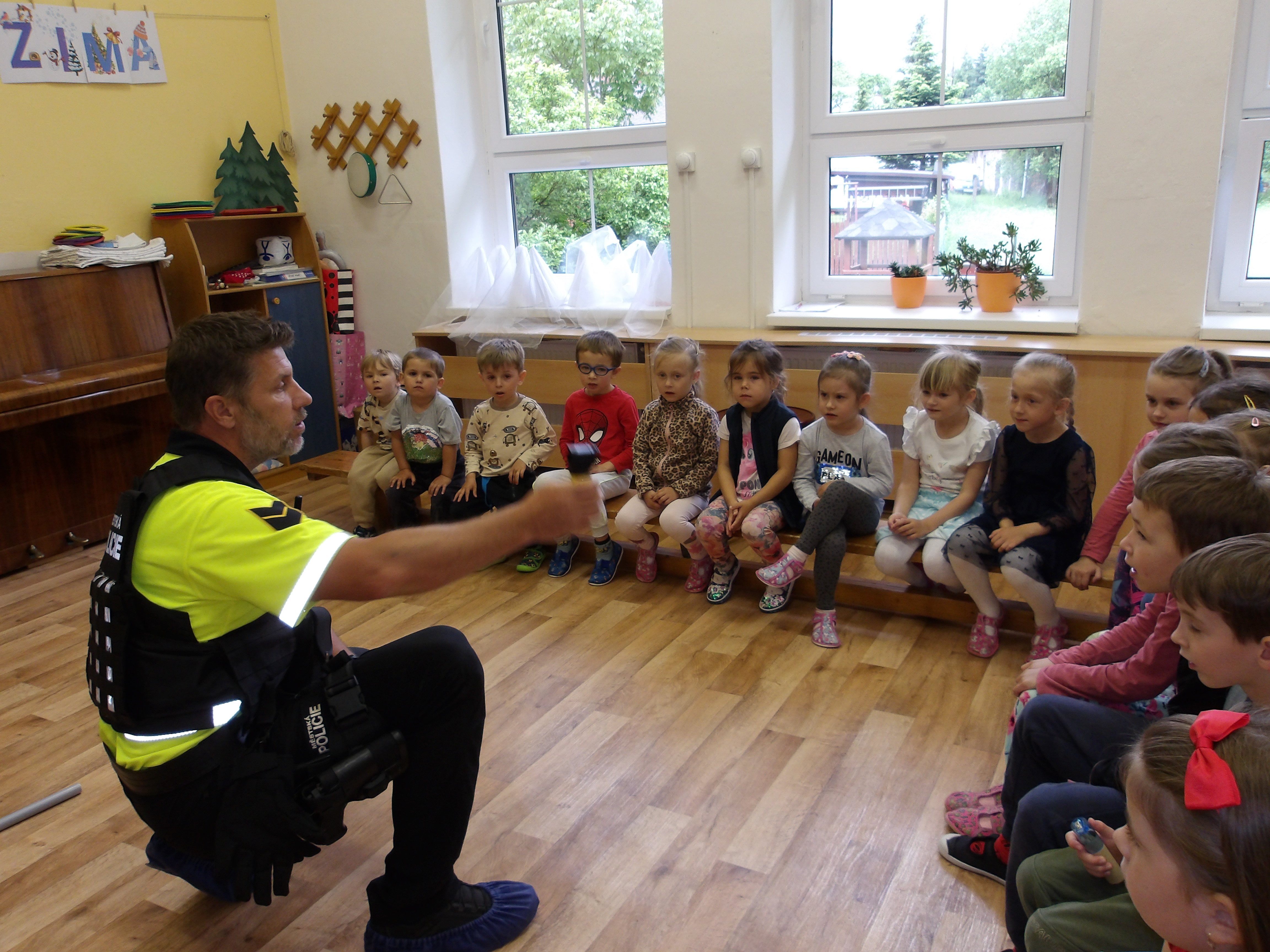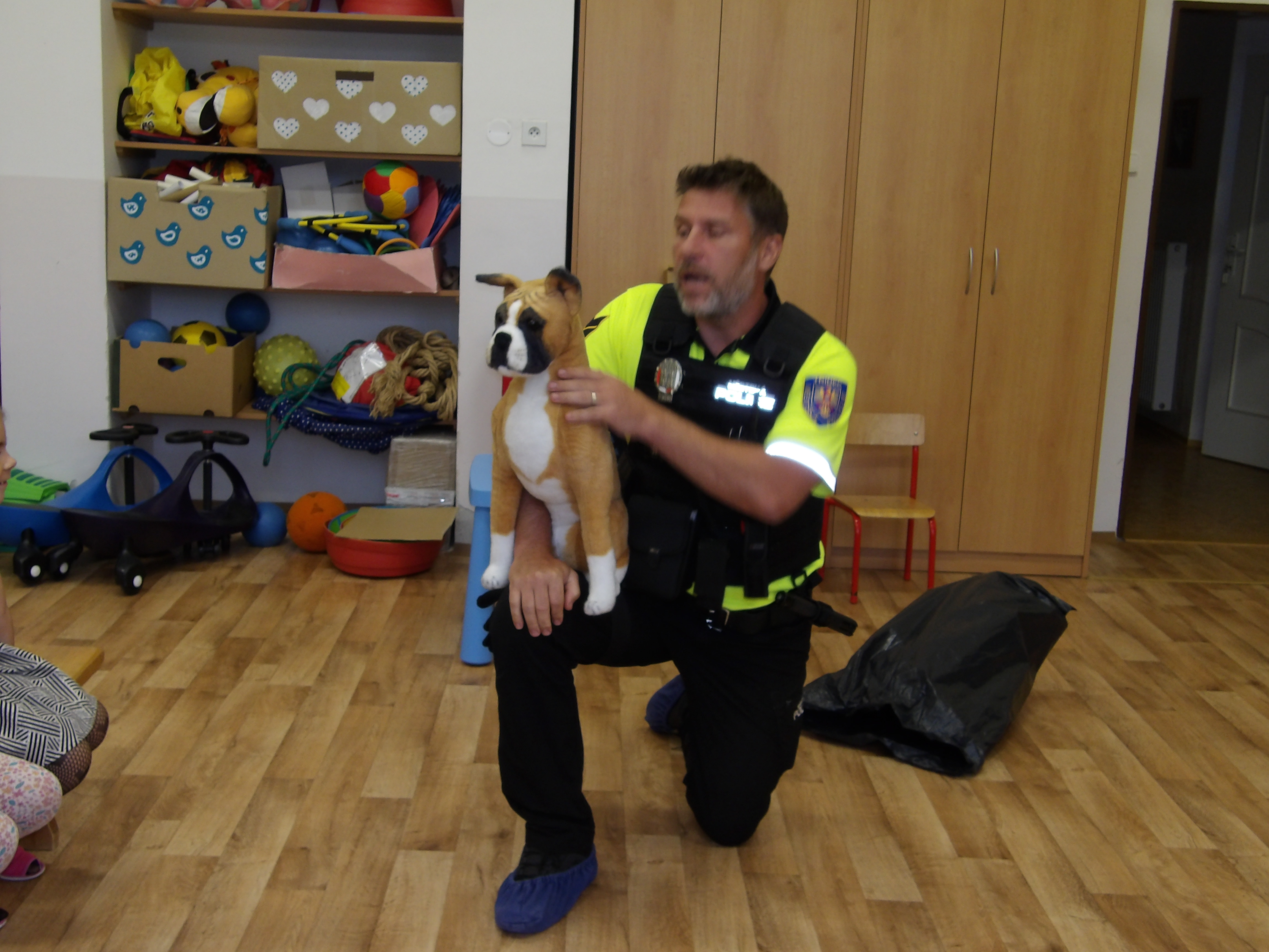 Ve školce nás navštívil pan policista a děti seznámil s tím, jak reagovat při setkání s cizím psem, člověkem, jak se chovat v některých situacích v dopravě. Také si děti připomněly, na koho se obrátit v různých vyhraněných situacích. Bylo to velmi příjemné a přitom poučné setkání. Děkujeme